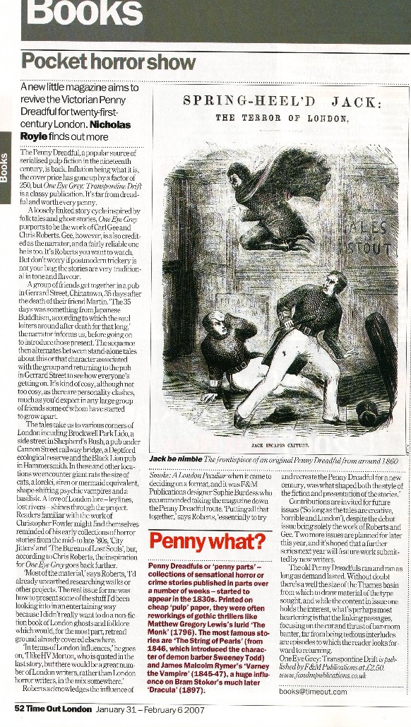 Though we were also amused by the Amazon review which described the publication as the 'best thing since sliced bread and about the same size.' And confused by the Guardian's description of it as 'a-price-of-a-pint-of-Stella rather than a shilling shocker'. £2.50 for a pint of wife beater? In London? Surely not. Link to Guardian review. One the other hand we got a proper review from a proper paper representing one of London's proper boroughs. The Ward Without the City, Southwark. ‘A dread good read. Inspired by a century old genre but addressing timeless fears in a modern voice, (One Eye Grey) will be scaring commuters witless for a long time to come.’ Southwark News Weekender Link to Southwark Weekender Feature 'Delightful Fortean stocking filler with -hooray!- more to come next year'. Fortean Times